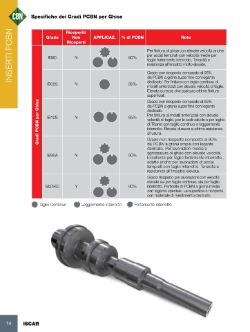 INSERTI PCBN                                Grado   Ricoperti/  APPLICAZ. % di PCBN                   Note