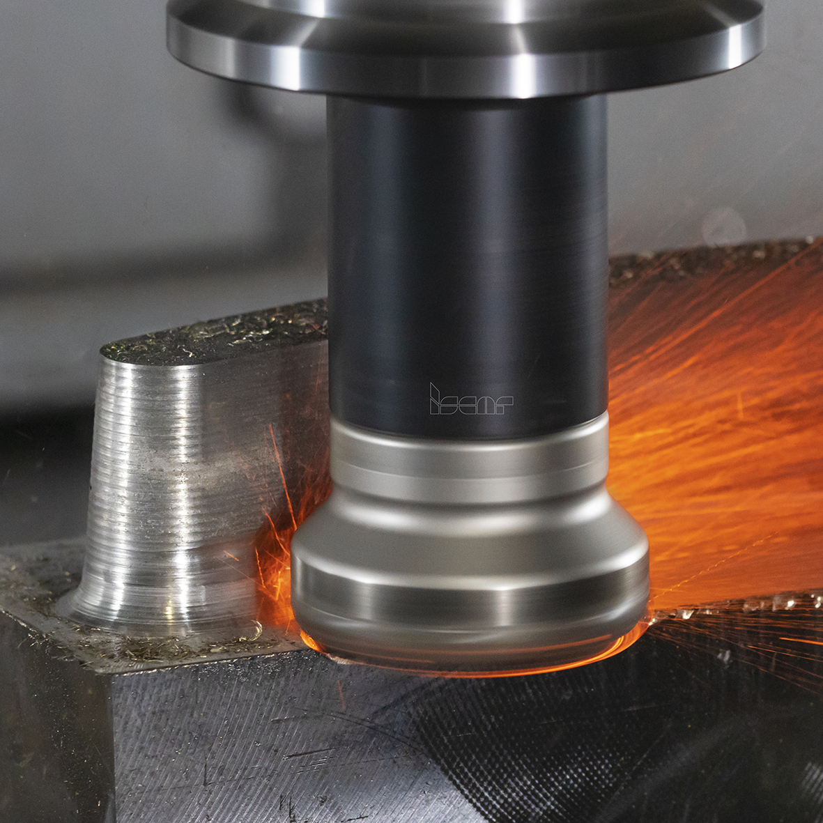 [Fig. 2- – Mecanizado de un componente de implante de rodilla femoral con una fresa MULTI-MASTER y un cabezal de barril cónico intercambiable