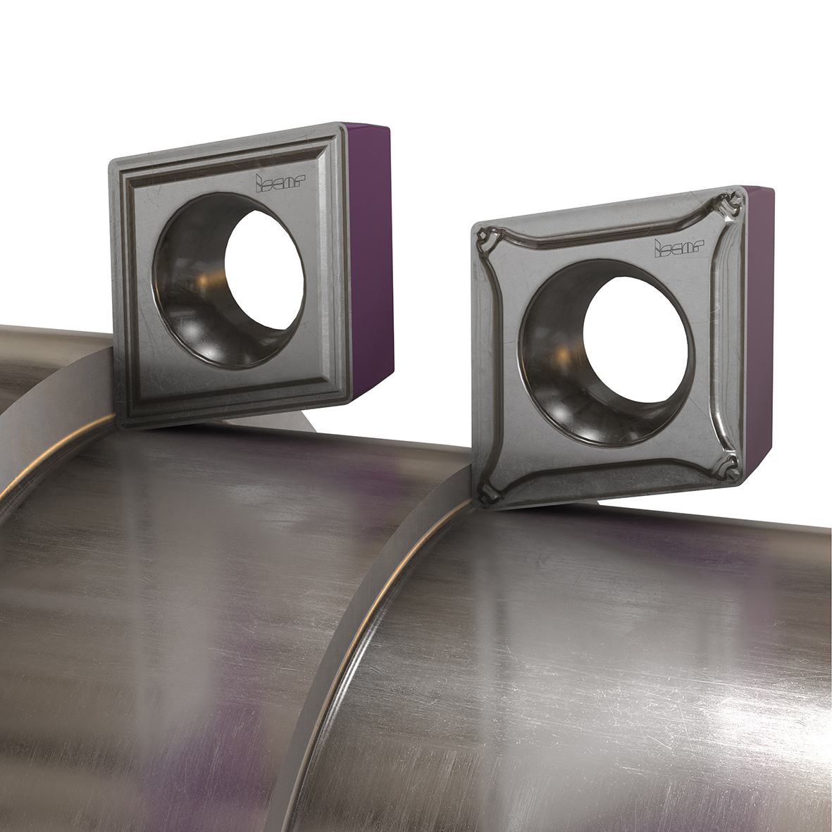 Los últimos diseños de conformadores de viruta F3M y F3P para plaquitas de torneado estándar ISO están diseñados específicamente para acero inoxidable austenítico duro y superaleaciones (Fig. 4). Su geometría de ángulo de desprendimiento positivo reduce la fuerza de corte y garantiza una acción de corte suave, mientras que el conjunto de deflectores en la superficie del desprendimiento mejora el control de la viruta. En las plaquitas cerámicas de doble cara para herramientas de torneado y fresado, se han añadido nuevas opciones de características de filo facetadas y combinadas (facetadas y redondeadas) para aplicaciones difíciles.