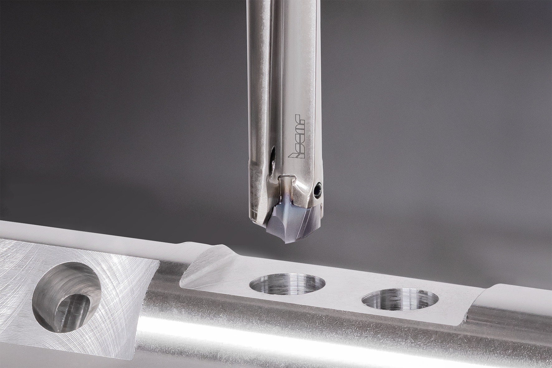 MODUDRILL, a family of modular hole-making tools, has expanded with new replaceable heads designed for relatively large diameters ranging from 30-40 mm. These products feature two fully effective cutting edges: one SUMOCHAM head at the center and two trigon-shaped indexable inserts on the periphery (Fig. 2). In the modular assembly, the newly introduced replaceable heads enable stable and productive drilling up to an 8:1 hole-depth-to-diameter ratio without the need for a pre-drilled hole.